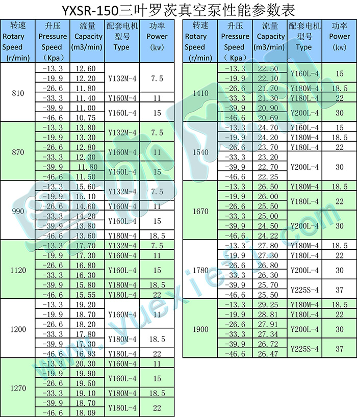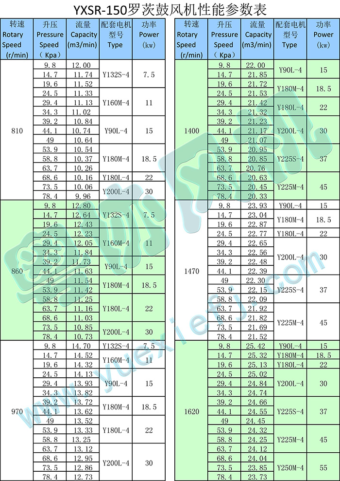 - 產(chǎn)品簡(jiǎn)介:三葉羅茨鼓風(fēng)機(jī)有鼓氣和吸氣兩款,YXSR-150系列的三葉羅茨鼓風(fēng)機(jī)的流量范圍在4.93~27.15m3/min之間。